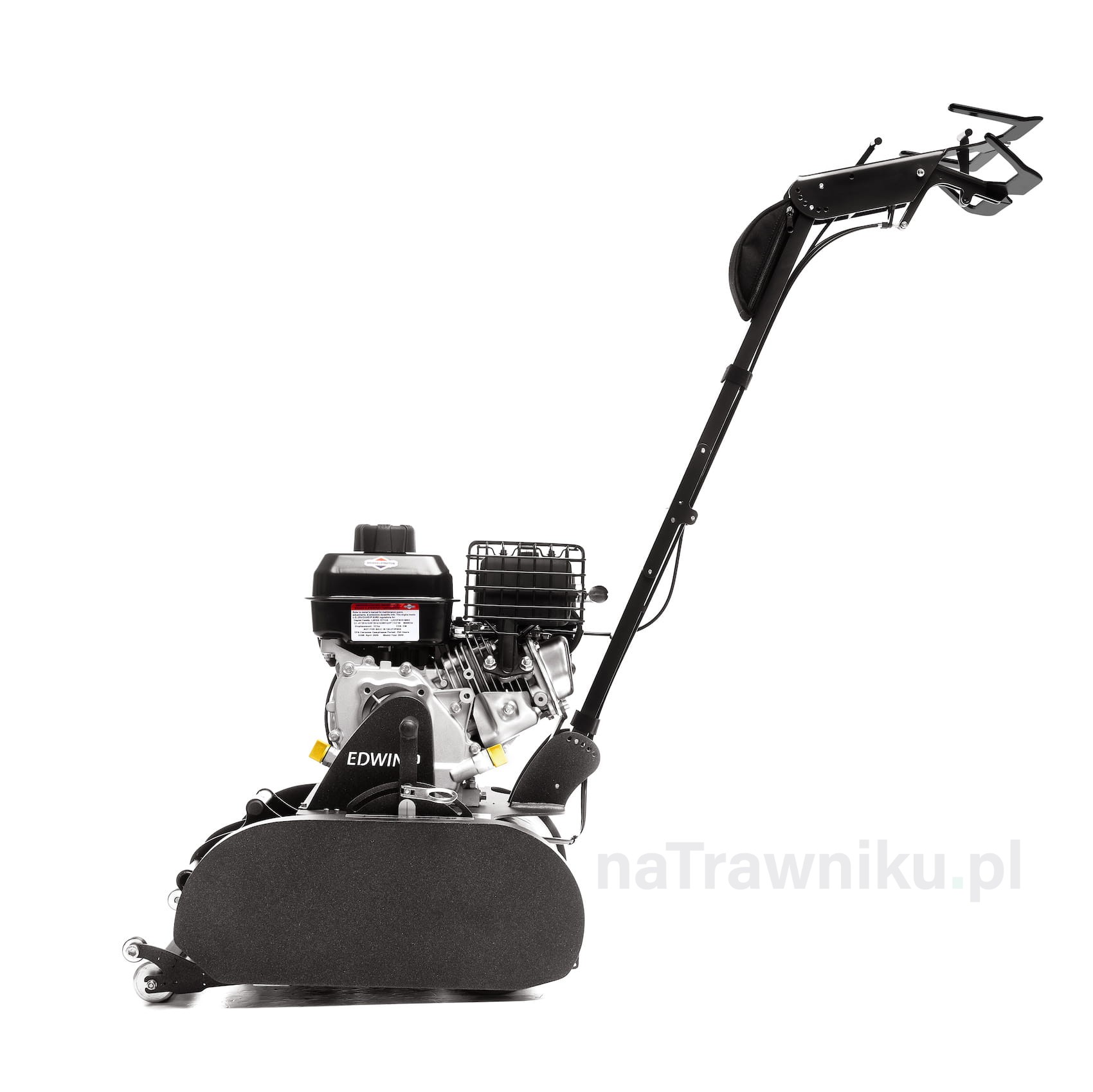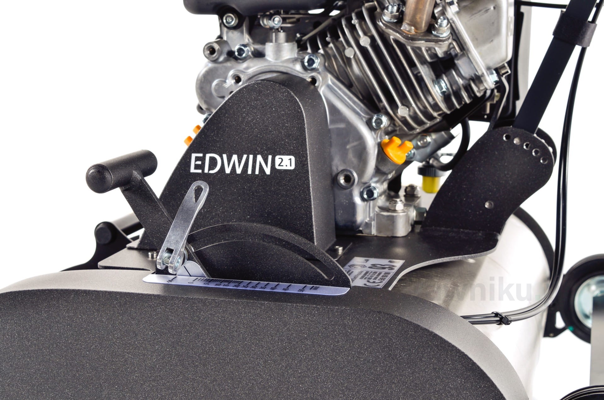 Kosiarka Edwin 2.1 wyposażona jest w czterosuwowy silnik benzynowy Briggs & Stratton, który zapewnia napęd maszyny i równocześnie napędza wrzeciono lub kasety regeneracyjne. Wielofunkcyjny system kaset regeneracyjnychpozwala na szybkie przezbrojenie Edwina z kosiarki na wertykulator, skaryfikator lub zamiatarkę do piasku.